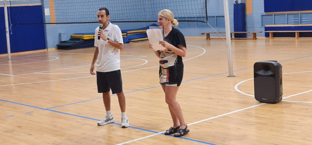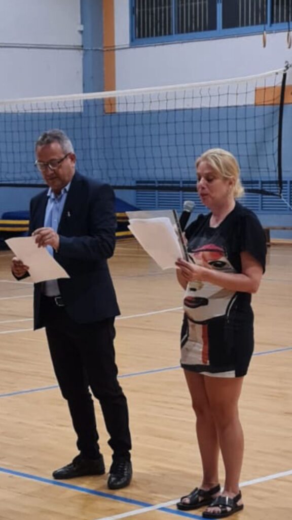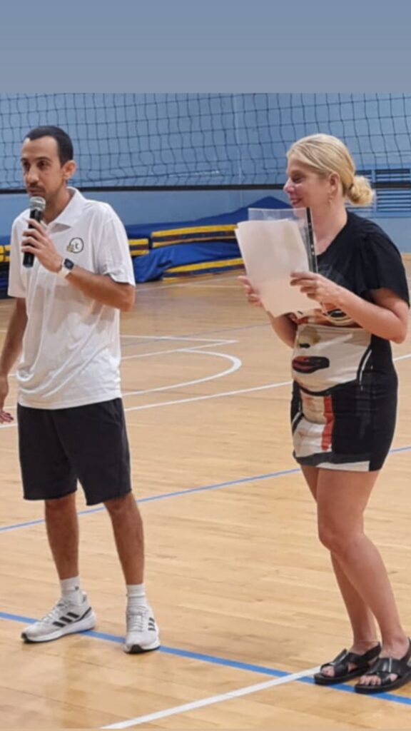 בתמונה מימין: מנחת הערב וחברת העמותה הפעילה החברתית עדי זהר עם יו"ר עמותת מכבי ראשון לציון בכדורעף עו"ד רפאל ג'רבי בדברי ברכה . צילום: פרטי.