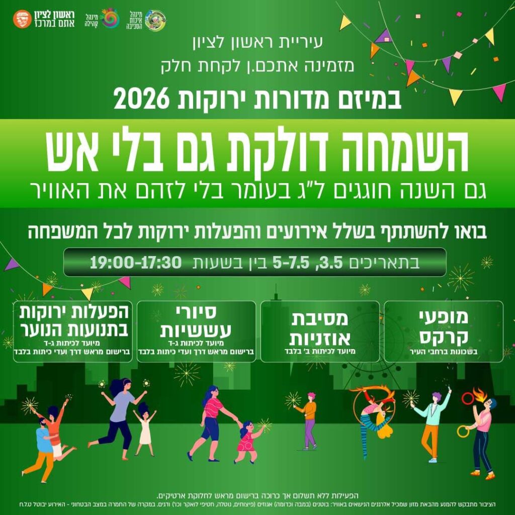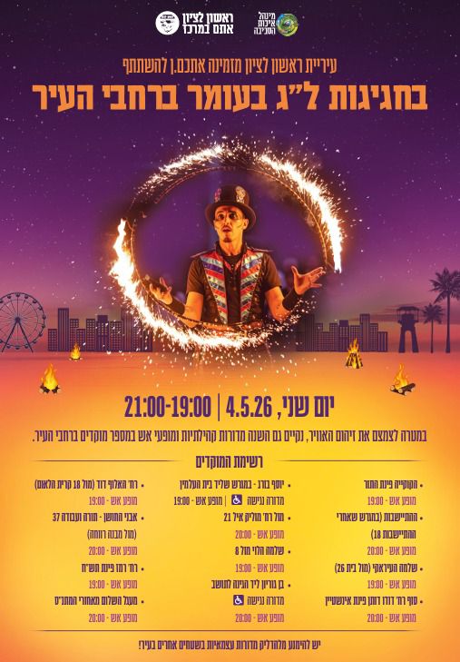 עיריית ראשון לציון תחגוג גם השנה את ל"ג בעומר במתכונת קהילתית, בטוחה ונעימה, עם מגוון פעילויות לכל המשפחה ברחבי העיר במשך שבוע שלם, בין התאריכים 3-7.5.26. זו השנה החמישית ברציפות שהעירייה מקיימת את חגיגות ל״ג בעומר באופן מוסדר, ירוק וידידותי לסביבה, לטובת רווחת התושבות והתושבים
